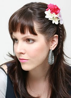 Puxe o cabelo todo para trás e faça um rabo. Envolva-o com um arranjo de pérolas, fixando a flor na lateral.